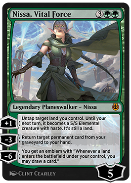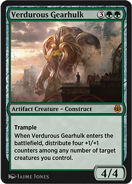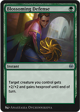 Verdurous Gearhulk is great as the upper end of the curve for an aggressive creature deck, either pushing the creatures already in play over the top powerwise or coming down as an 8/8 after a board wipe. Nissa, Vital Force is amazing for midrange green decks especially land decks with her early -6 ultimate. Blossoming Defense is an important resource for green tempo decks that want to protect their best threats while also pushing damage.