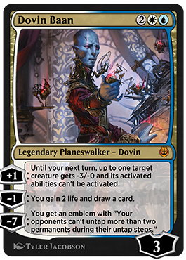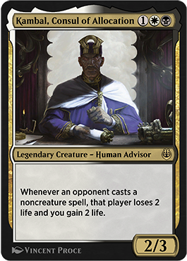 Unlicensed Disintegration was a worthwhile version of Murder for a lot of decks in Standard and here can fit in well with heavy removal Rakdos builds. Kambal is great against spell-based strategies such as burn or control. Dovin Baan protects itself as well as having a devastating ultimate for grindy matchups.