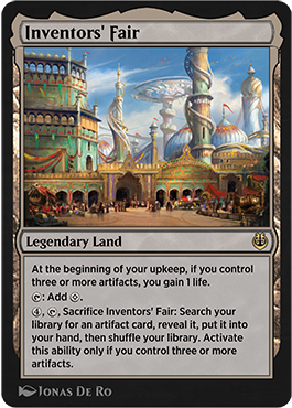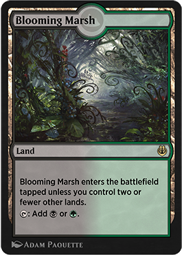 Spire of Industry allows five-color artifact decks to have access to pain land so that their mana base is a little bit easier on them. Inventor’s Fair can be a powerful tutor to Aetherflux Reservoir or Paradox Engine for instance. Blooming Marsh along with the other enemy fast lands are great dual sources for aggressive decks.