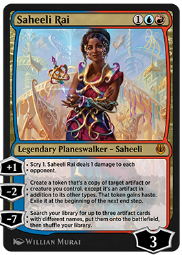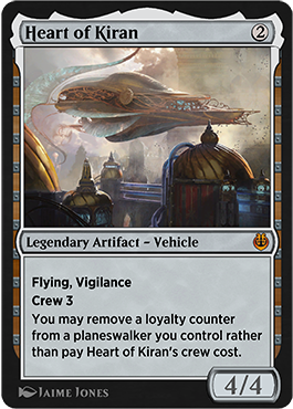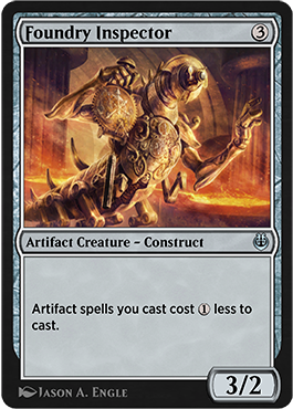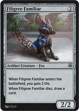 Heart of Kiran is a great early play in planewalker decks that protects your walkers but also doesn’t die to a wipe. Foundry Inspector is nice for artifact storm decks by allowing them to go off faster. Filigree Familiar can be an effective pod target to give you life on ETB and a card on LTB.