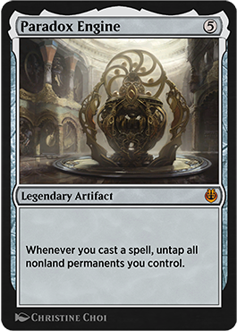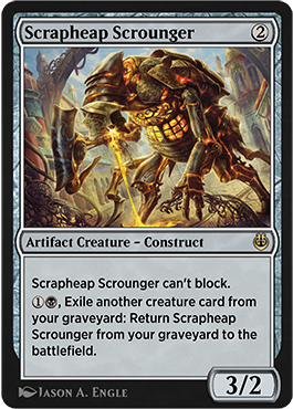Skysovereign is effective repeatable removal against aggressive decks and avoids board wipes against control. Scrapheap Scrounger keeps coming back in black decks as they will have plenty of creatures to exile if removed by opponents. Paradox Engine pairs well with Aetherflux as an engine for artifact storm, allowing you to untap your rocks on every spell.